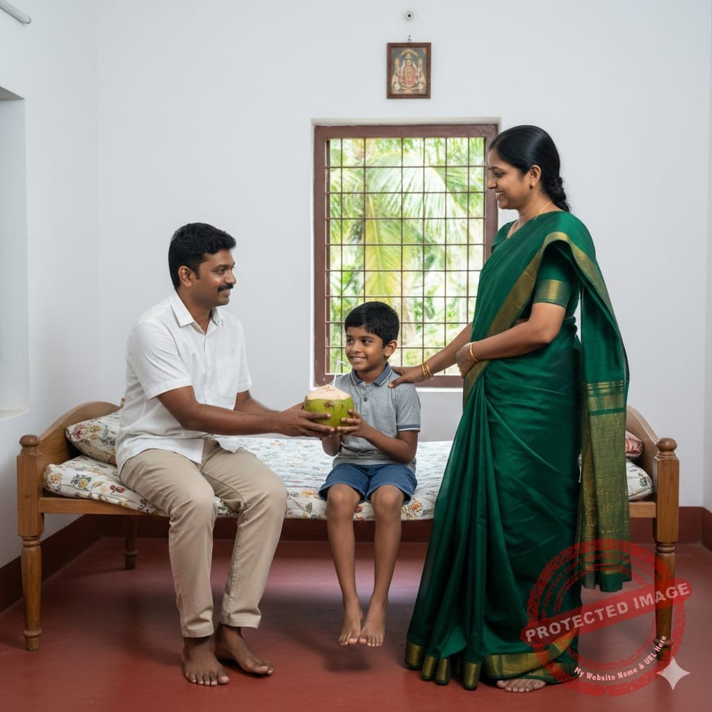 அப்போது இளநீருடன் உள்ளே வந்தார் அப்பா. “அப்பா இளநீர் குடிக்க கூடாது, அது குளிர்ச்சின்னு என் நண்பன் சொல்றான்”