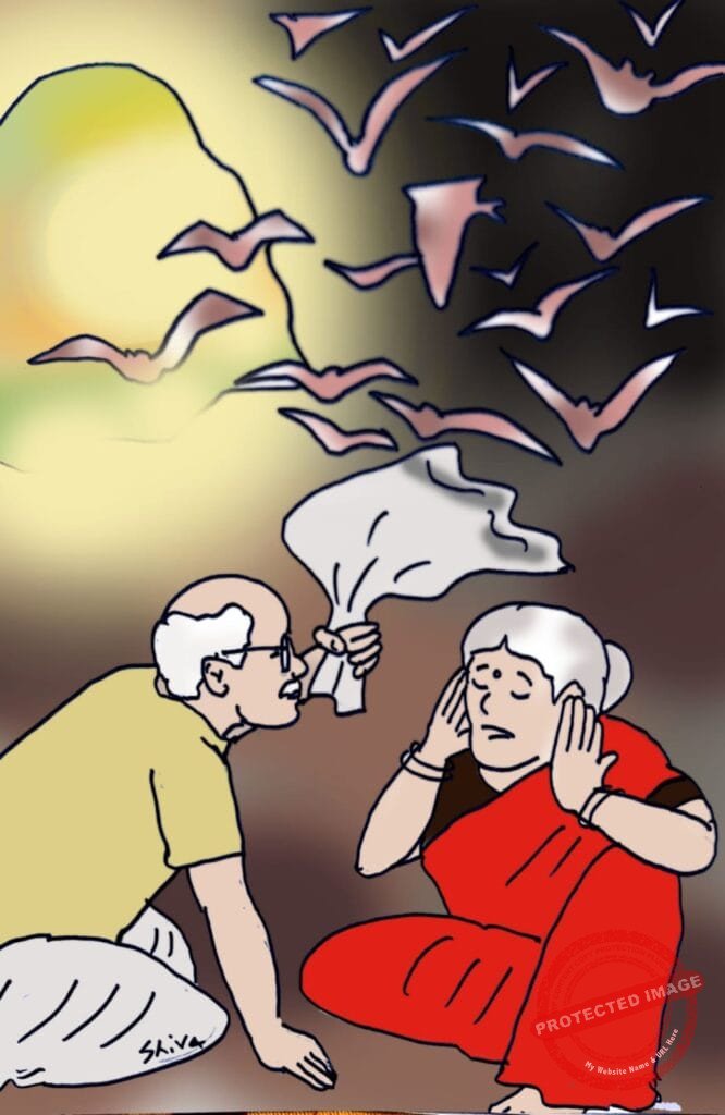 ஊர்க்காரர்கள் அலறியடித்துக் கொண்டு குகை வாயிலைப் பார்த்து ஓட, மீனுப்பாட்டியும் சொக்கு தாத்தாவும் சட்டென்று கீழே குந்திய நிலையில் அமர்ந்து வௌவால்களிடமிருந்து தப்பித்தனர்.