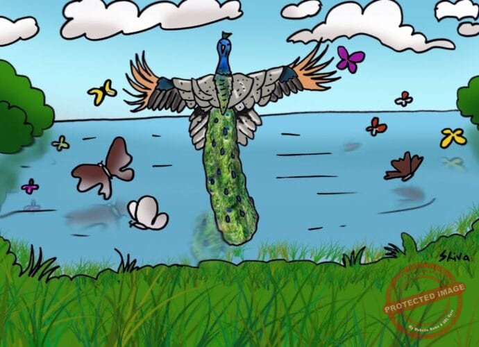 அந்த மயில் தன் தோகையை விரித்து நான்கு குழந்தைகளையும் அப்படியே தூக்கித் தன் முதுகில் அமர வைத்துக் கொண்டது.